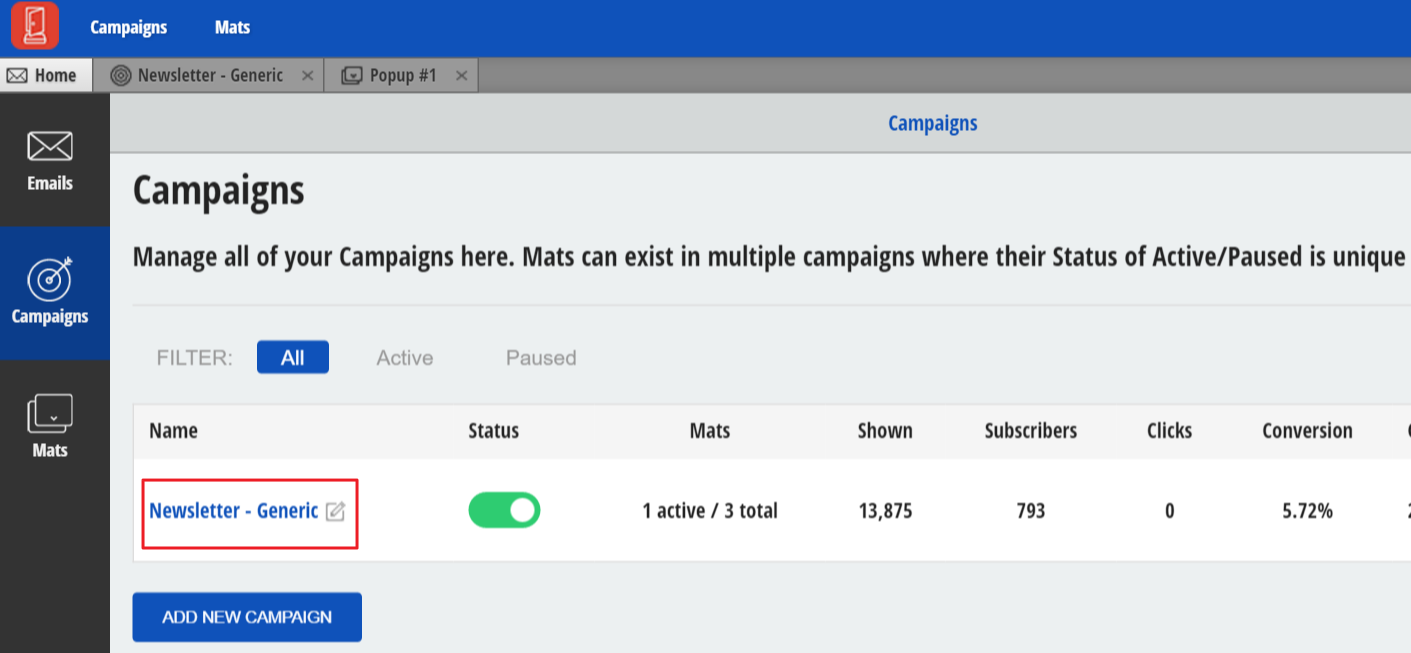 Instead of going straight to the design tab, youāll navigate to the ācampaignsā tab and click āAdd New Campaignā.