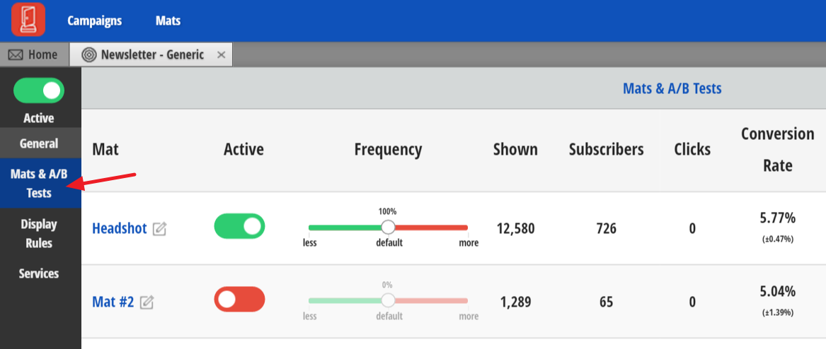 Click the "Mats and A/B Tests" tab and create another Welcome Mat to test. Set each one to display 50% of the time: