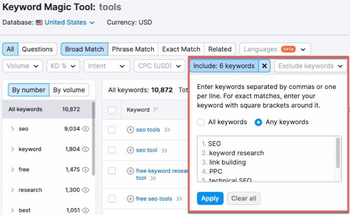 Next, enter a modifier like “best” or “tools” into the Keyword Magic Tool. Then in the “Include keywords” box, select “Any keywords” and add those features/functions: