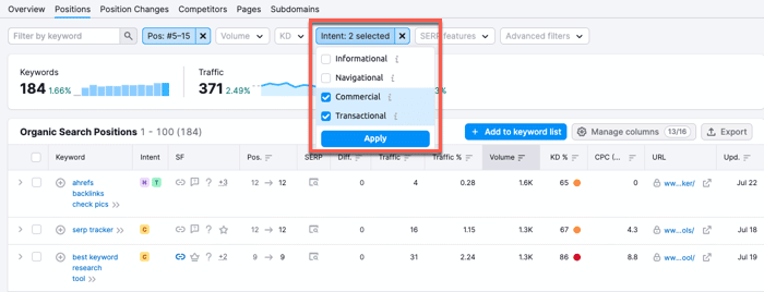 You could also add a commercial or transactional intent filter to identify the “monetizable” keywords with a better chance of boosting rankings with some backlinks. For example, I might want to generate some additional affiliate income: