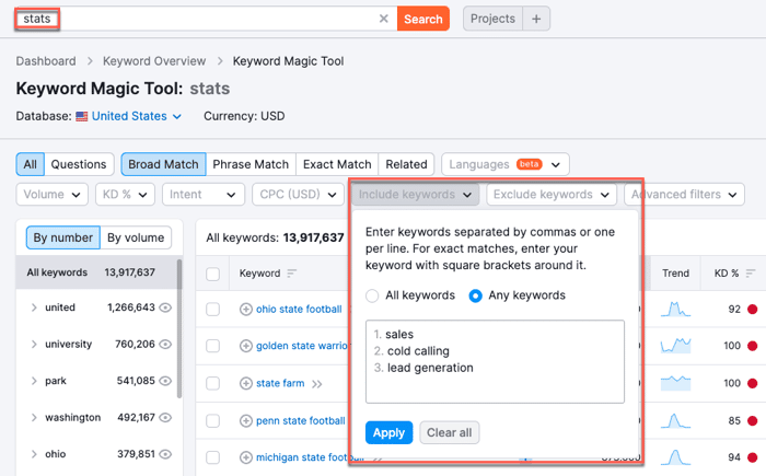 - Enter a modifier – e.g. stats or trends – into the Keyword Magic Tool.