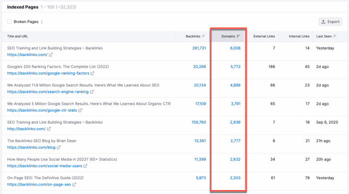 For example, on Backlinko, I can quickly see in the Domains columns that the site has URLs with thousands of backlinks related to: