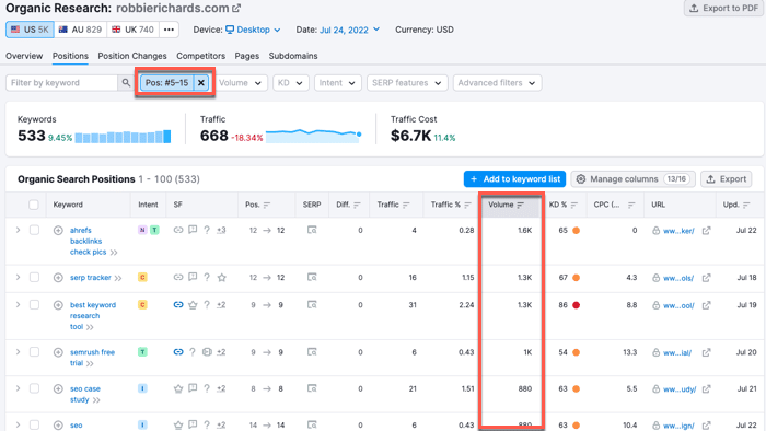 - Enter your domain into the Organic Research report – e.g. test.robbierichards.com