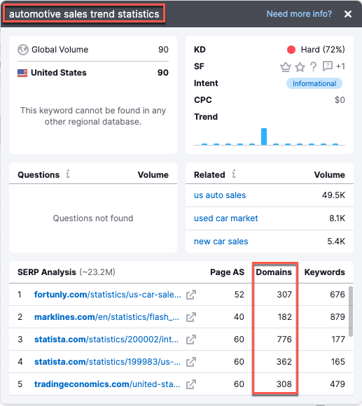 Next, to quickly confirm that these are linkable topics, you can click the “>>” next to a keyword and open up the SERP overview report. Here’s an example of “automotive sales trend statistics”: