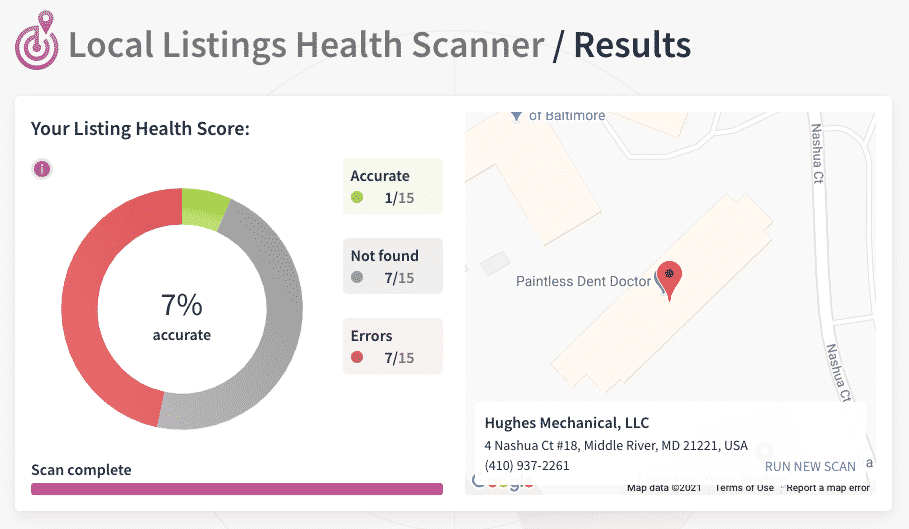 Notice how their scan shows that only 1/15 listings are 100% accurate, while 7 are not found and another 7 contain errors:
