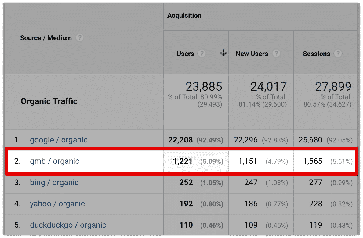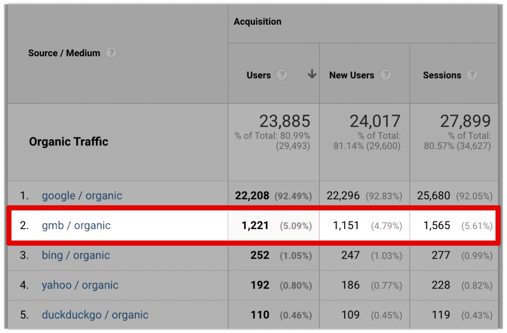 In doing so, whenever you check your Google Analytics Acquisition reports you’ll be able to distinguish between visitors who came to your site organically through a GMB listing and organically through the traditional search results.
