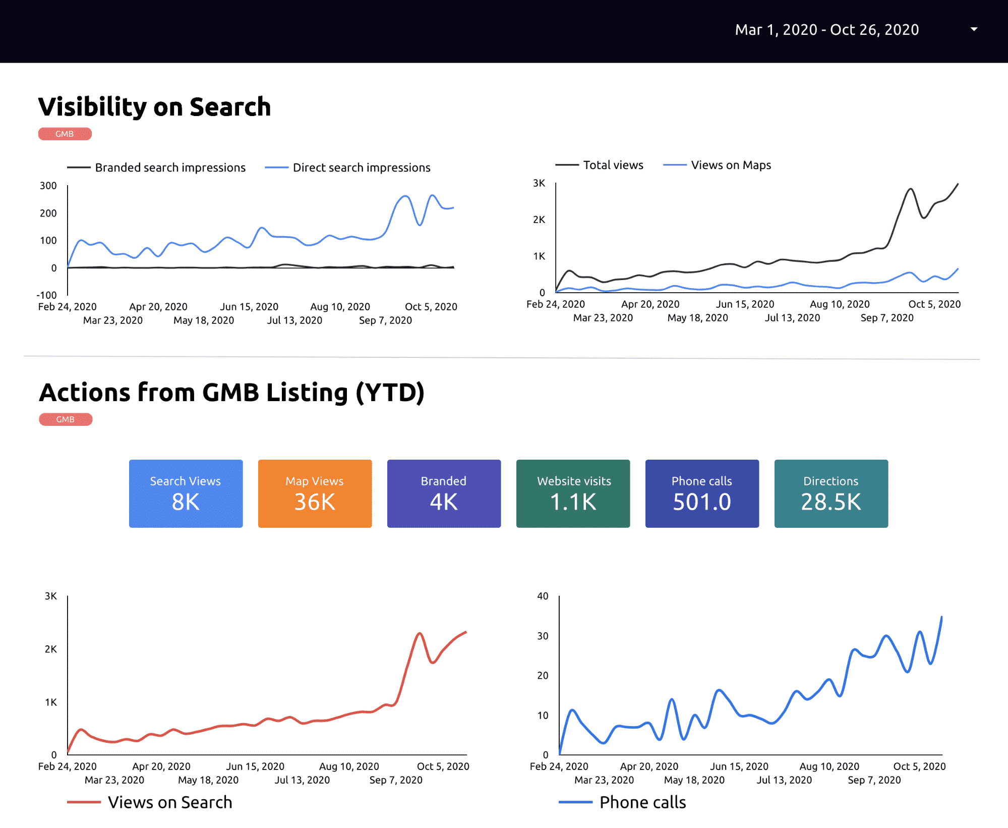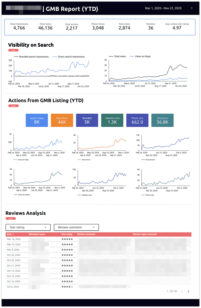 In Google Data Studio you can report on important KPIs originating from GMB like: