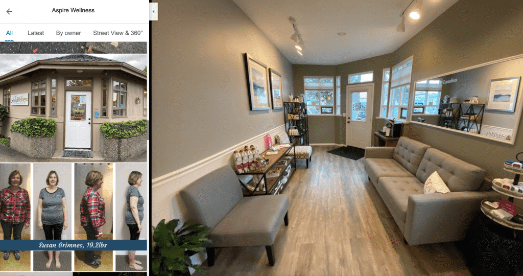Be sure to fill out your Google Business Profile with your logo and photos of your premises. Take a look at this example from local weight loss clinic, Aspire Wellness, they even went as far as to add great before and after photos in their GMB profile! This is a great example of a local business taking full advantage of the power of GMB photos.