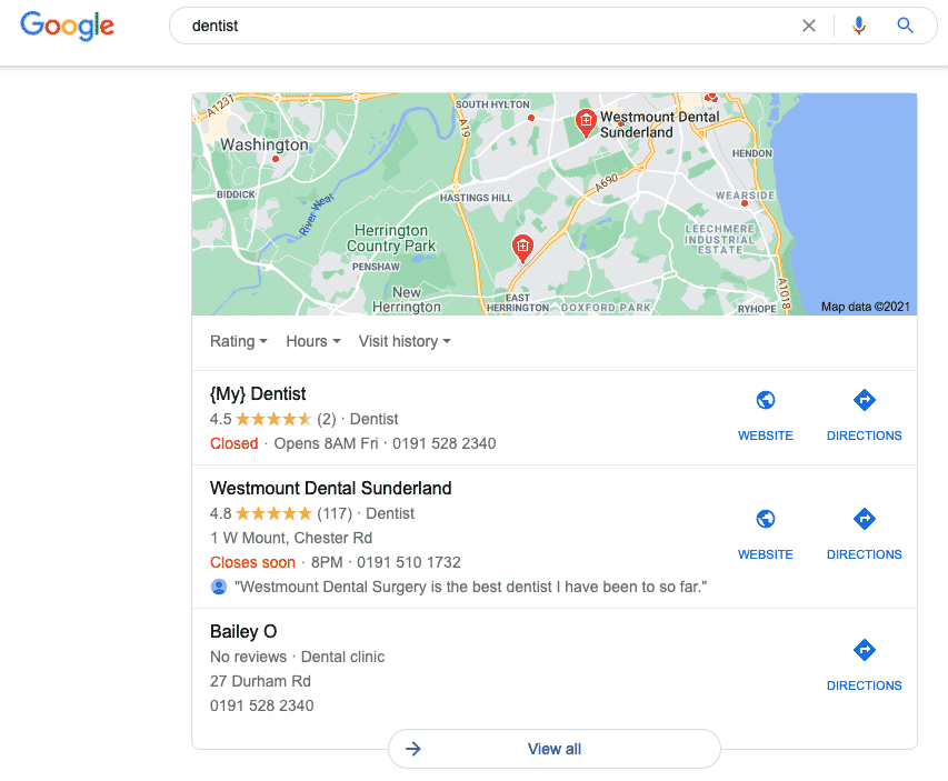 Search ‘dentist’ on your desktop or mobile and Google will preempt that you’re looking for the nearest place to get your teeth looked after through a Google Map Pack: