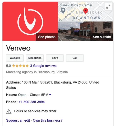 If your business has been around for a while, Google might have generated a Business Profile for it already – as it has for Venveo:
