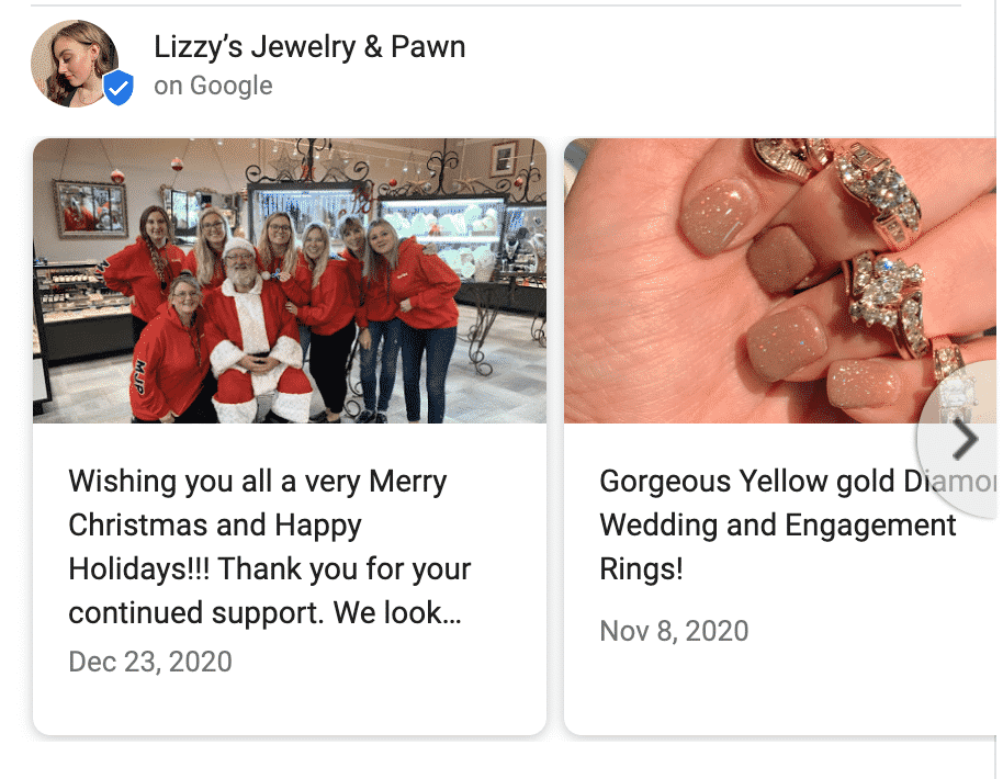 They’re a great way of making your Google Business Profile stand out. Notice how Lizzy’s Jewelry & Pawn does this by taking advantage of things like holiday events, in-store specials, discounts, product features.