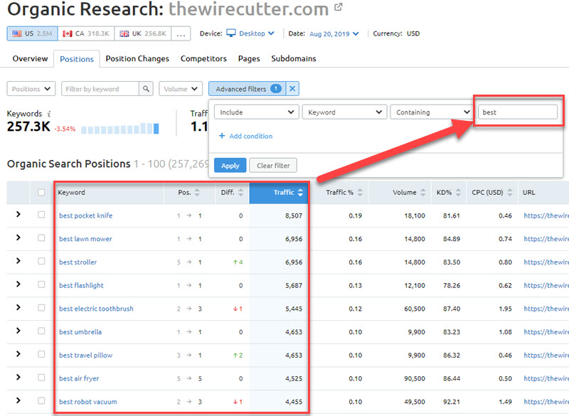 - If you run an affiliate site, then you’d want to dissect traffic by keyword modifiers like “best”, “alternative”, “top”, “vs” etc.