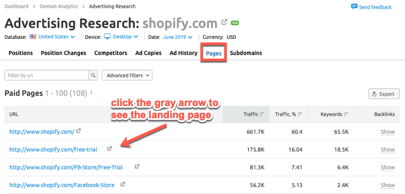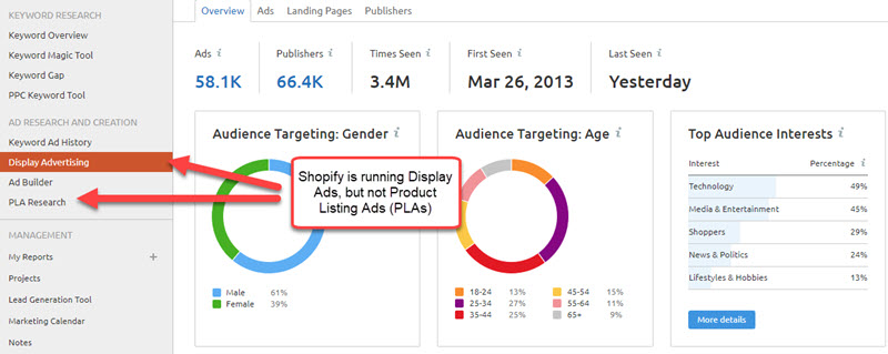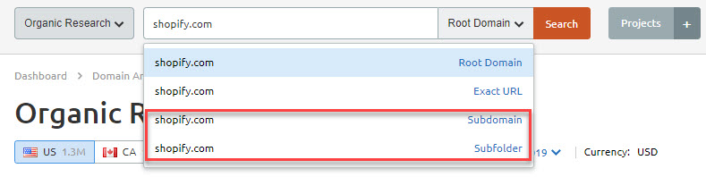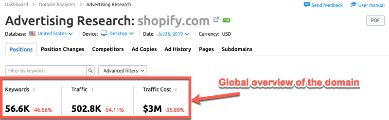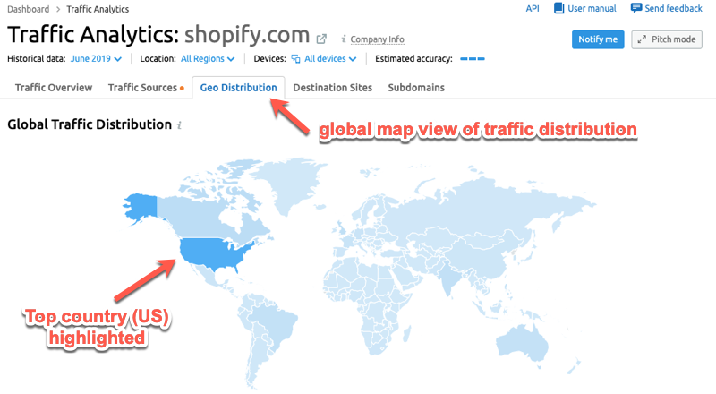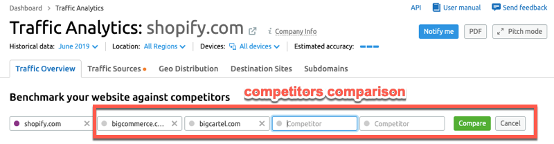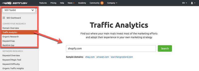 In SEMrush, click on Traffic Analytics from the side menu and enter the domain – e.g. “shopify.com” – you want to analyze: