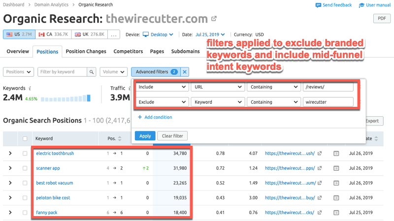 - By keyword - Finally, for organic and paid channels, you can drill down and find out which keywords (and modifiers) drive the most traffic across different stages of the funnel - top, middle and bottom.