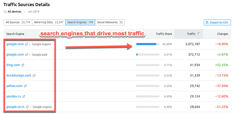 If you select the Search Engines tab, you'll see which search engine drives most traffic: