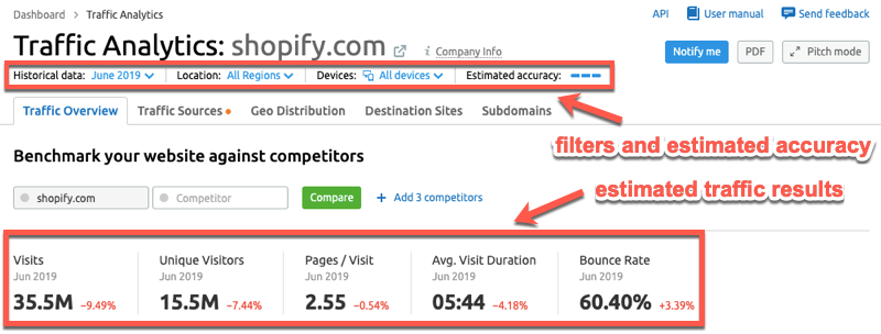 You can apply filters – historical data, location, and device – to modify the results. And next to the filters is a set of blue bars noting the Estimated Accuracy of the report, which is based on the size of the domain and filters.