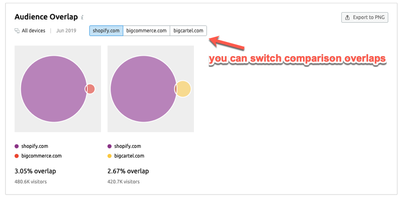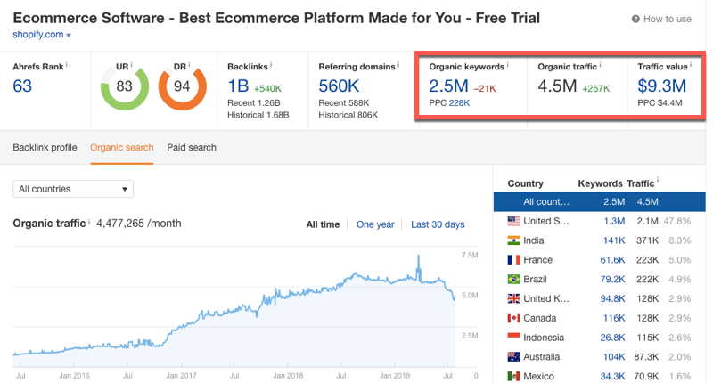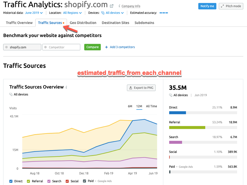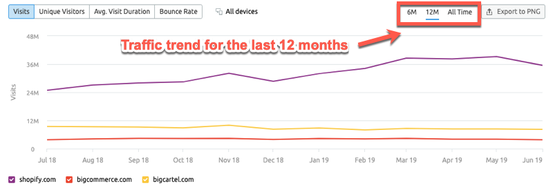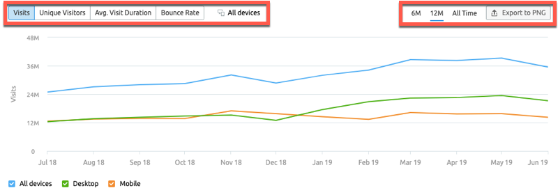 In our example, you can see visits (all sources) to Shopify were increasing steadily up until March 2019, then plateaued for a couple months, before taking a drop at the beginning of June. Note: this could be the result of getting hit by the June Google core algorithm update. We’ll dive into this more later.