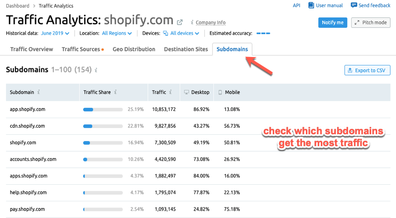 - All website traffic - We’ll start by looking at the total amount of traffic a website gets each month, check estimated engagement metrics, and break down the numbers by device type.