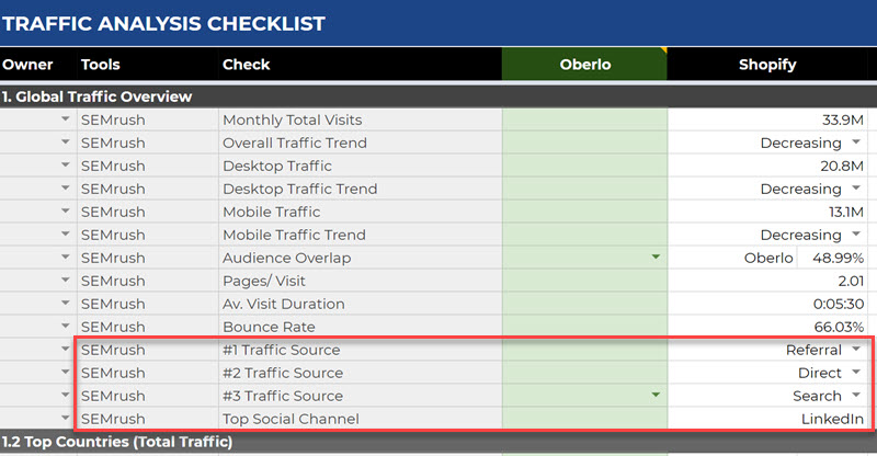 Go to the Traffic Sources tab and enter the top 3 traffic channels for each website into the Global Overview section of the template: