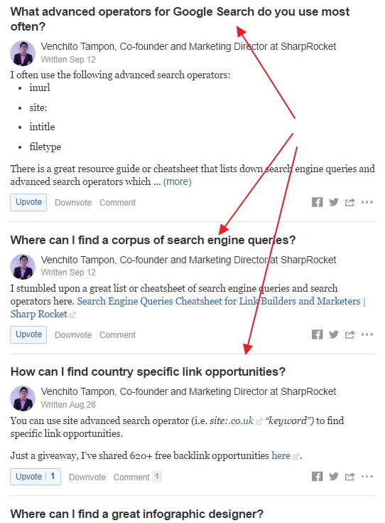 Do a Quora search and you’ll find dozens of threads you can participate in. Since I offer link building and off-page SEO services, I look for question boards specifically related to those topics: