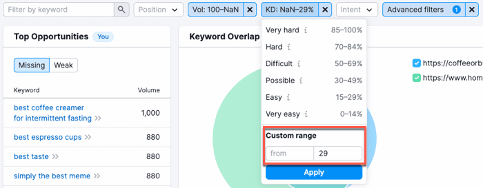 If you’re a brand new site, or the list of keyword opportunities is still massive, you can also apply a KD (keyword difficulty) filter to only identify low competition or easy keywords.