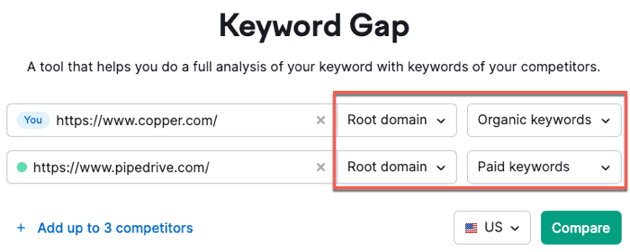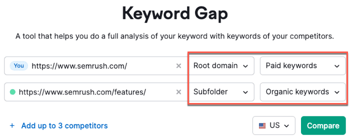 However, with the Semrush Keyword Gap tool, you can tailor your competitive analysis to: