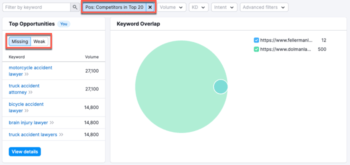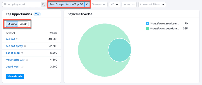 Filter the competitor keywords by top 20 positions to find the most relevant opportunities. (note: Anything outside that range may require a dedicated article.) Then scroll down to the missing keywords results: