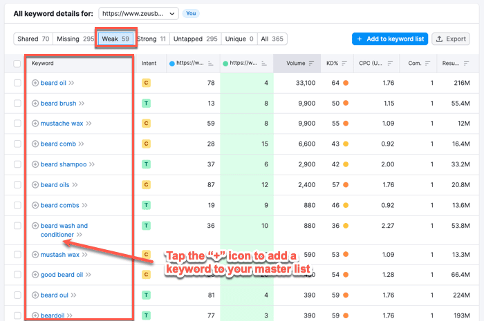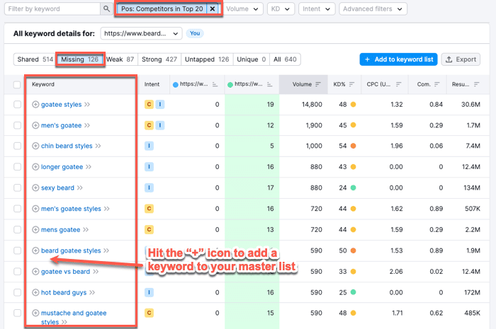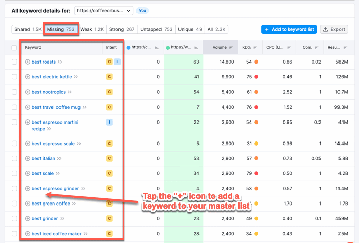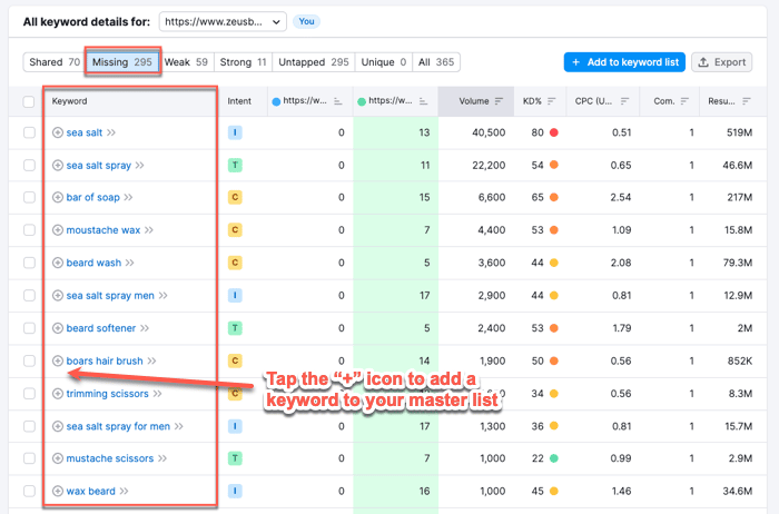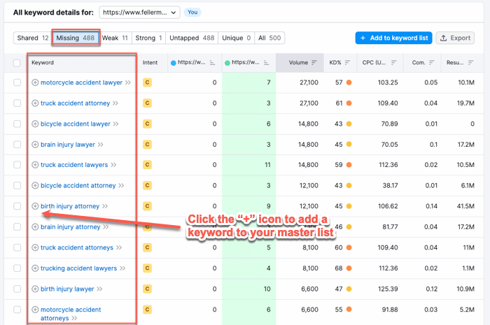 Then, simply hit the “+” icon next to any missing keywords you want to add to your master list of keyword opportunities.
