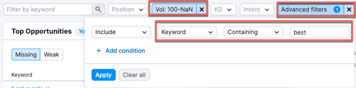 Since we know mid-funnel keywords with modifiers like “best” are most valuable for affiliate sites, we can use filters to quickly uncover those opportunities.