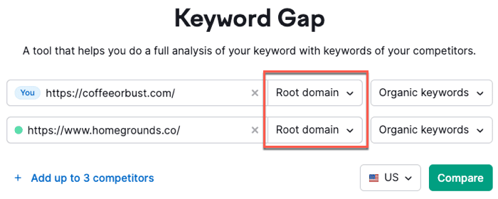 - Enter your competitor’s root domain – e.g. https://www.homegrounds.co/