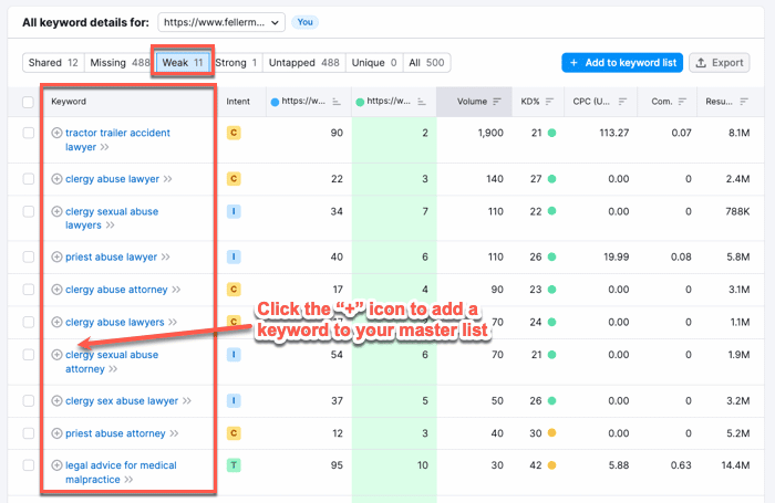 For example, for the local law firm subfolder keyword gap analysis, you could add any legal service keyword opportunities to a “Service Keywords” list: