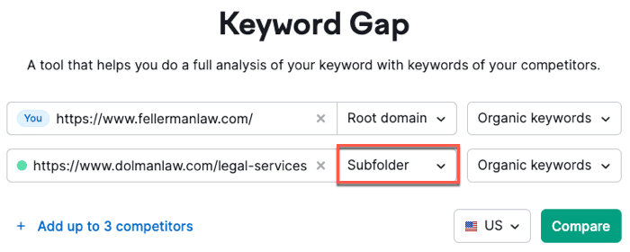 Dolman Law Group lists all its services in its website’s “/legal-services/” subfolder. Their competitor Fellerman Law can use subfolder gap analysis to find keywords they’re missing out on.