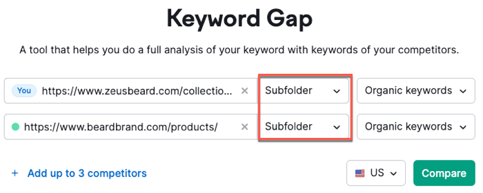 - Enter your competitor’s subfolder – e.g. https://www.beardbrand.com/products/