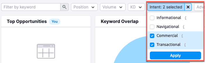Next, you can add filters to only show organic keywords in the top 20 positions with commercial or transactional intent: