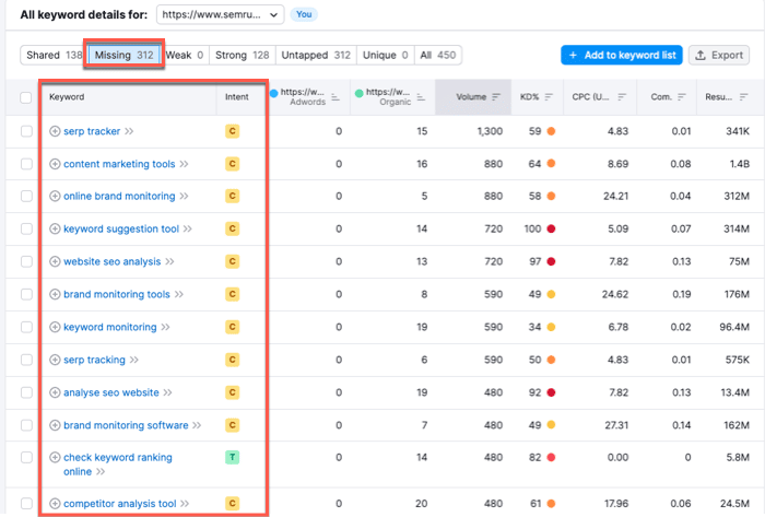 First, check the missing keywords to see which high-value terms your competitor ranks for, but you don’t: