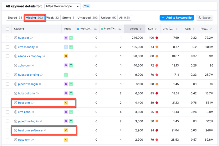 Now, scroll down to the missing keywords report. In this example, Copper has a potential 203 high-value keywords to target, including “best crm”, “best crm software”…