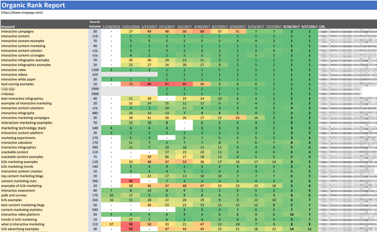 Note: At my search marketing agency, we also like to take the SEMrush keyword ranking data and populate into a Google Sheet with visual formatting to give the client a heatmap view of the rankings data: