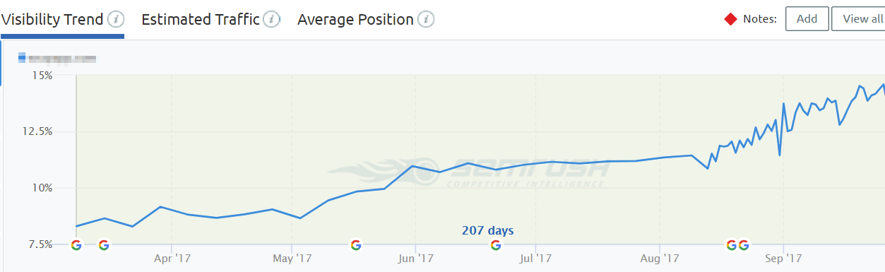 i.e. from top 20 to top 10, and then eventually into the top 3. It validates that what you are doing is working, and helps the client see the long term payoff. - Tool used: SEMrush
