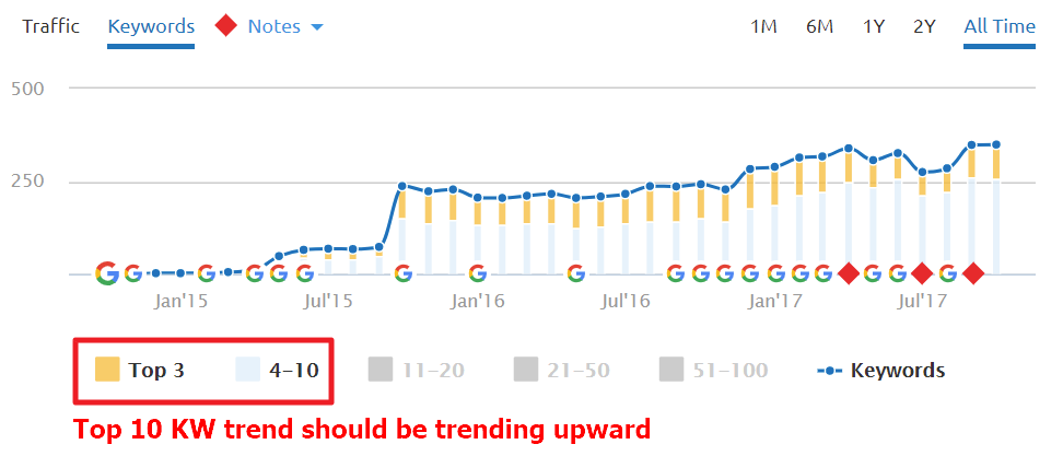 - Why it’s important: This is an important metric early on because SEO campaigns can often take a while to start generating significant traffic gains. So, you want to be able to show your keyword sets trending positively.