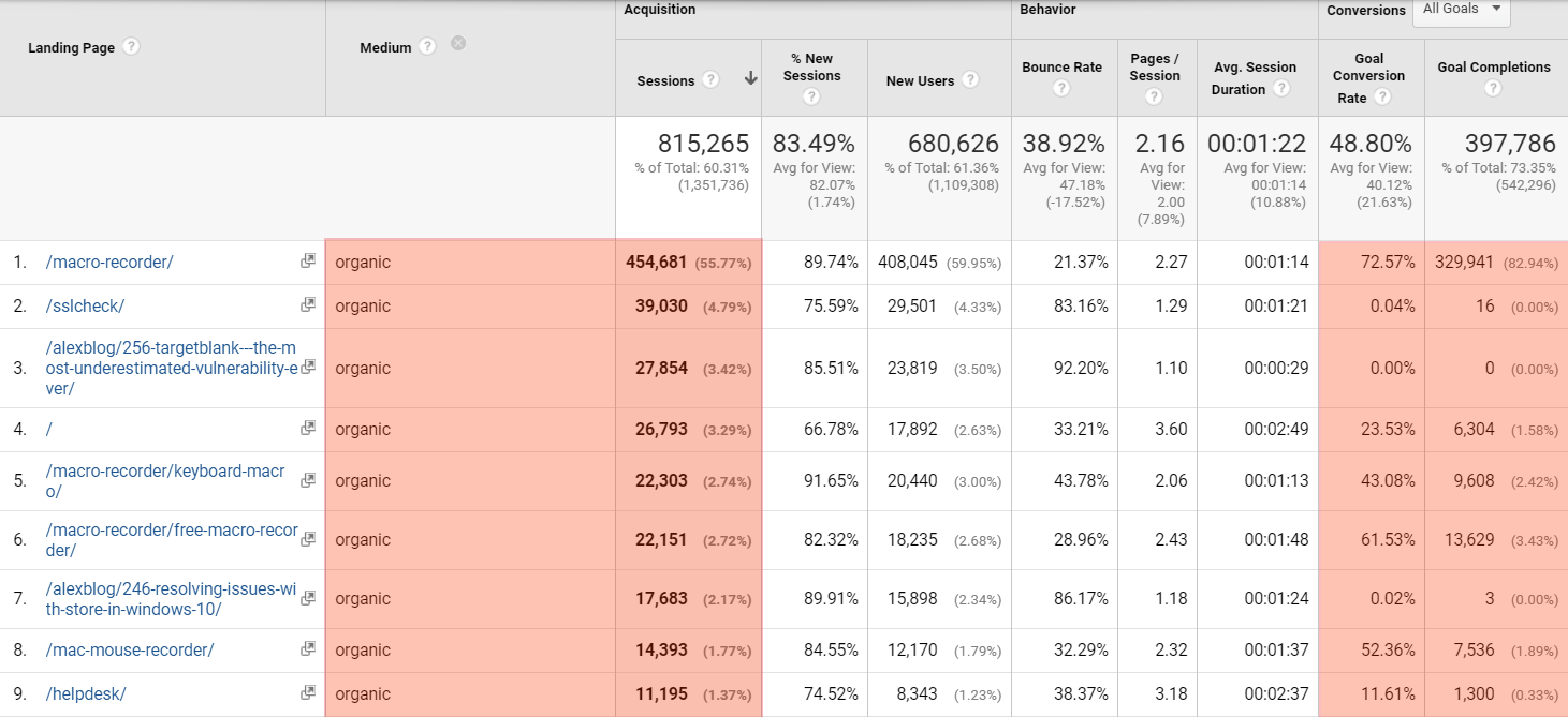 - Time on Page on organic traffic vs. other pages