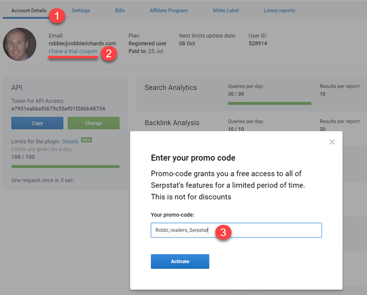 Remember to enter this exclusive promo code (robbie_readers_serpstat) in the Account Details section in your account to activate the trial.