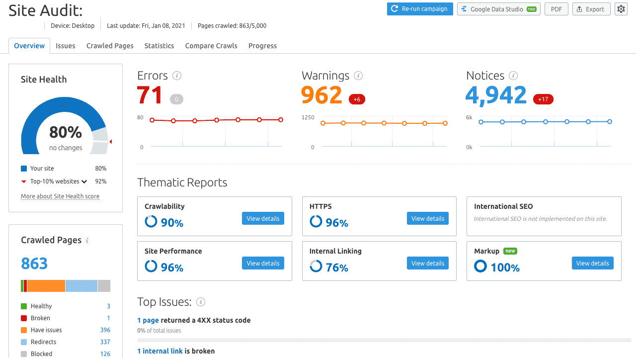 - Detect, prioritize, and resolve technical SEO issues with the Site Auditor.