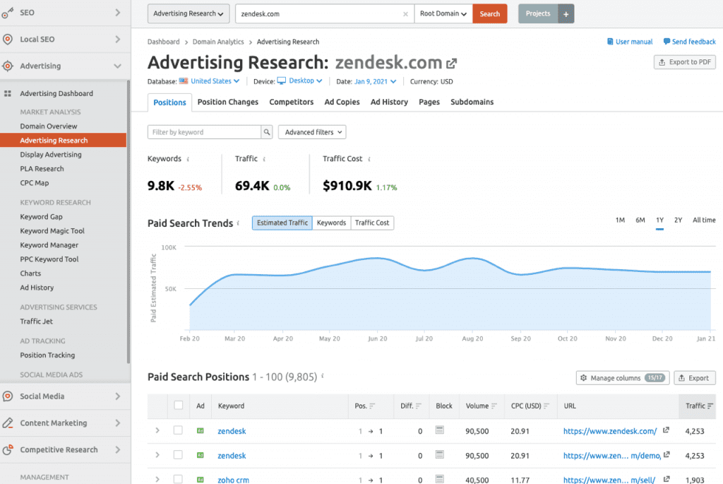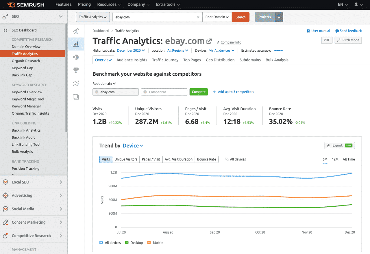 It’s an all-in-one platform that not only provides in-depth SEO and PPC competitor insights but also provides loads of other functionality for analyzing traffic strategies, researching keywords, analyzing backlink profiles, running technical audits, generating white-label reports, and more.
