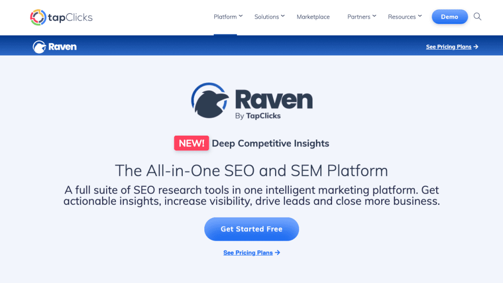 Raven is an all-in-one SEO and SEM marketing platform that includes competitor research, backlink analysis, rank tracking, technical audits, and performance reporting.