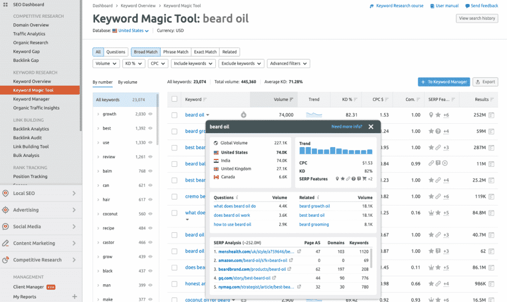 The Semrush SEO Toolkit (aff) provides access to an extensive database of over 20 billion different keywords. You can segment your terms by topic and use the accurate search volume data to unearth new keyword opportunities or analyze those of your competitors.