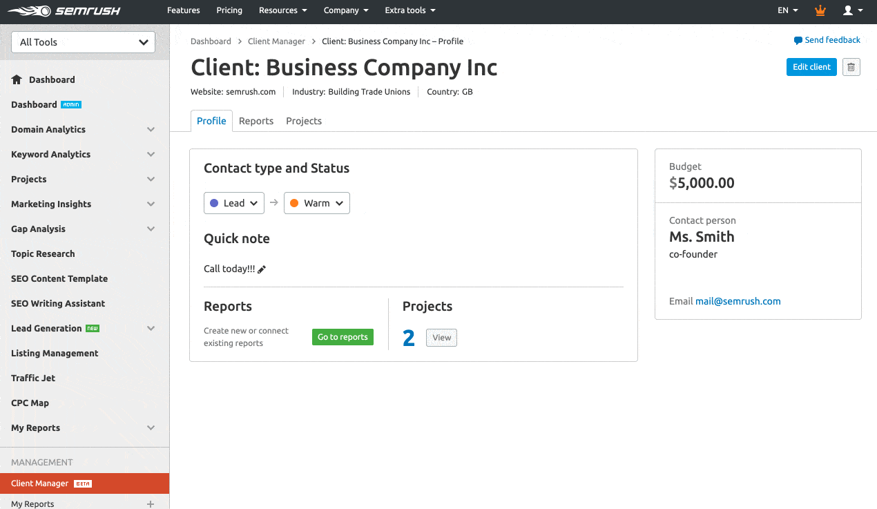 The Client Manager acts as a CRM and campaign management portal that’s perfect for consultants and agencies working across multiple clients.